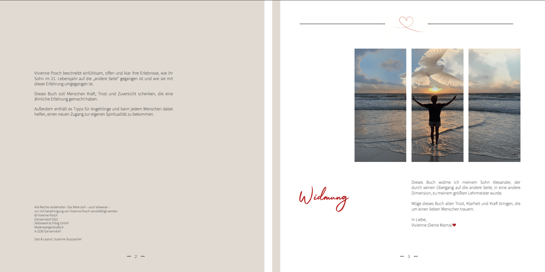 Vivienne Posch beschreibt einfühlsam, offen und klar ihre Erlebnisse, wie ihr Sohn im 21. Lebensjahr auf die „andere Seite“ gegangen ist und wie sie mit dieser Erfahrung umgegangen ist.